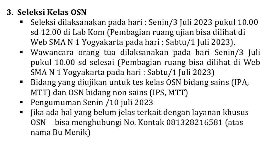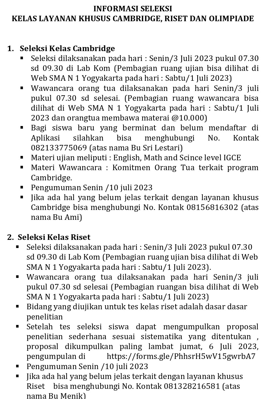 Informasi Pelaksanaan Kelas Layanan Khusus Cambridge, Riset dan Olimpiade :