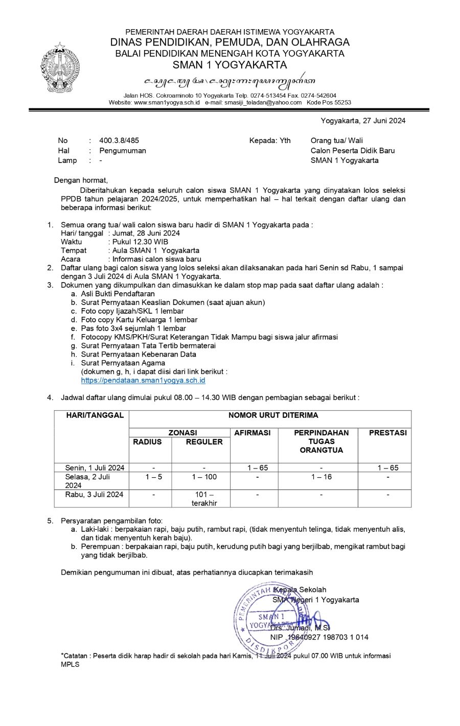 Kepada: Yth. Bapak/ Ibu Orang Tua/ Wali dan Calon Siswa SMAN 1 Yogyakarta yang dinyatakan lolos seleksi PPDB tahun pelajaran 2024/2025. Diharapkan untuk memperhatikan beberapa informasi terkait daftar ulang berikut :